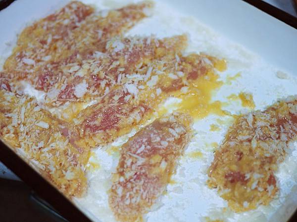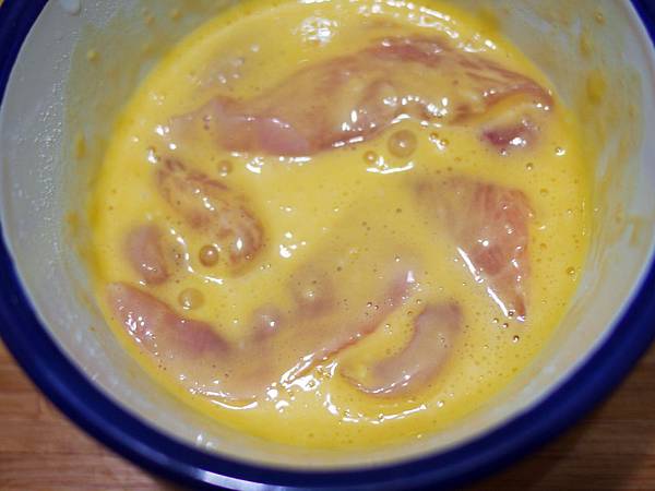 把雞肉條放入蛋黃麵糊裡,讓雞肉都均勻沾上麵糊