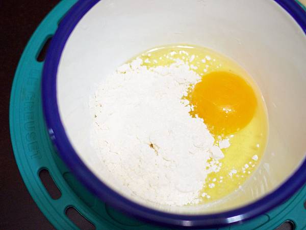 將雞蛋,麵粉,砂糖,鹽,砂糖,卡士達粉拌勻 (因為我家有小孩所以沒加胡椒),