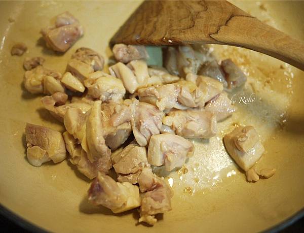 倒入些許橄欖油熱鍋後, 放入雞肉塊煎炒至8分熟起鍋備用