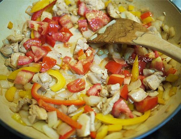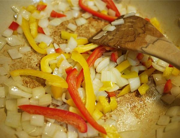 再將洋蔥炒軟炒至透明後,加入紅黃椒一起拌炒
