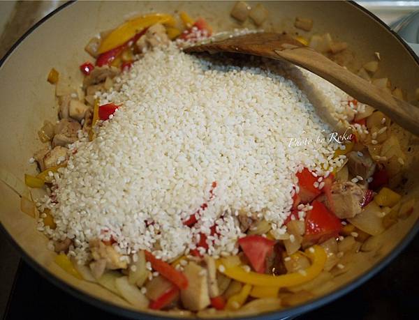 慢慢分次加入,米粒都吸了湯汁,炒到快乾再加高湯