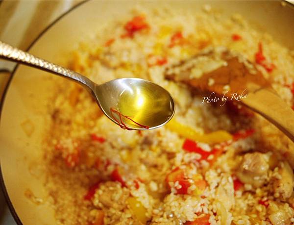 加入番紅花水拌炒米粒,米粒會略為變色至橙黃色