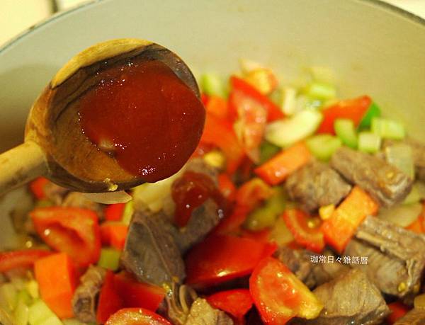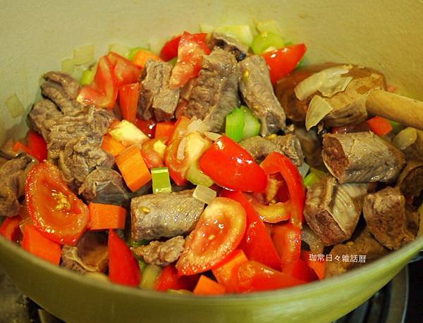先將已汆燙過的牛肉塊煎至兩面金黃後,再放入西芹及牛番茄和紅蘿蔔塊一起拌炒至蔬菜軟化