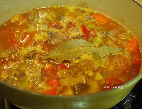 加水淹過食材煮滾後放入月桂葉2片,蓋鍋小火燉煮40分鐘至牛肉軟嫩(可用筷子插過去試)