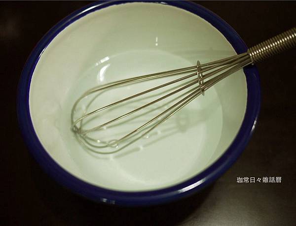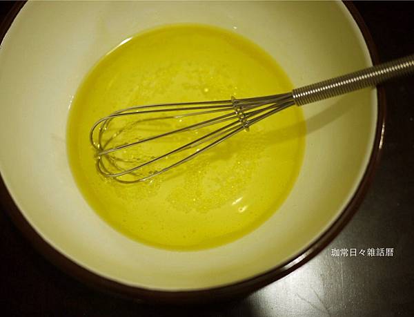先將溫水和砂糖及鹽倒入盆中用打蛋器攪拌均勻至溶化