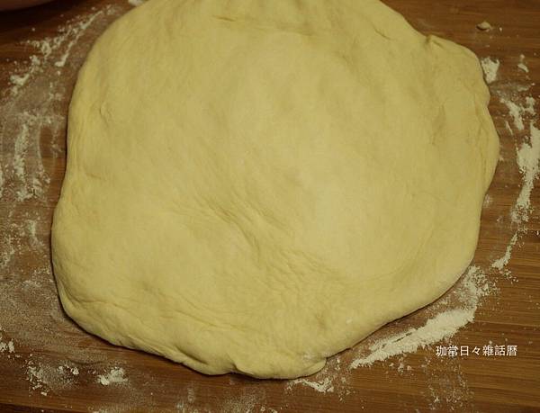 取出麵糰放在已撒麵粉的工作檯上, 輕壓麵糰排出空氣