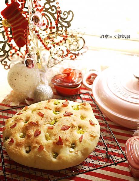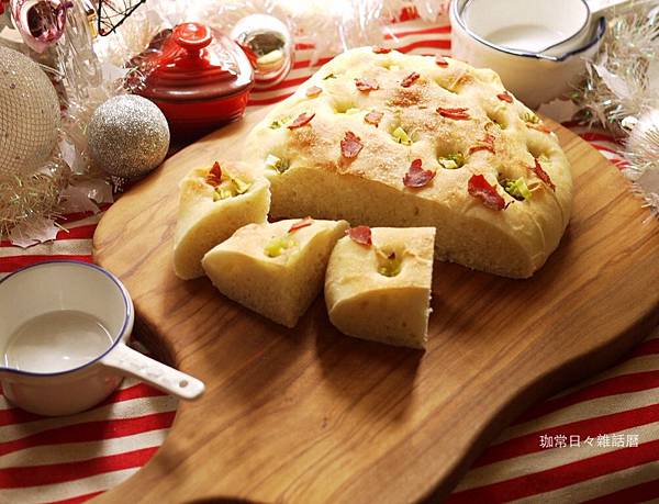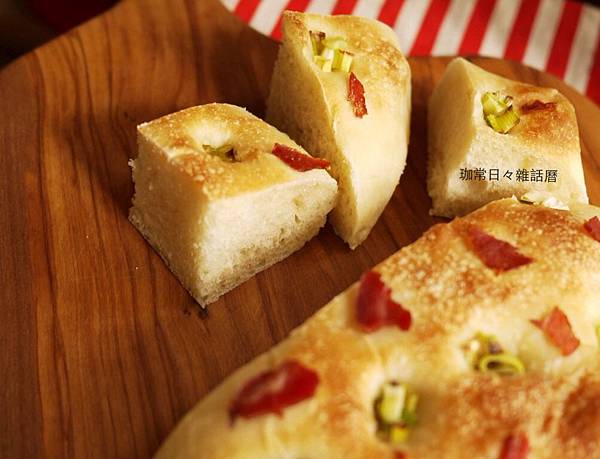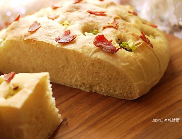 佛卡夏麵包帶著橄欖油和蔥花的清香,加上培根和岩鹽的鹹香滋味