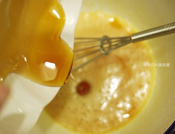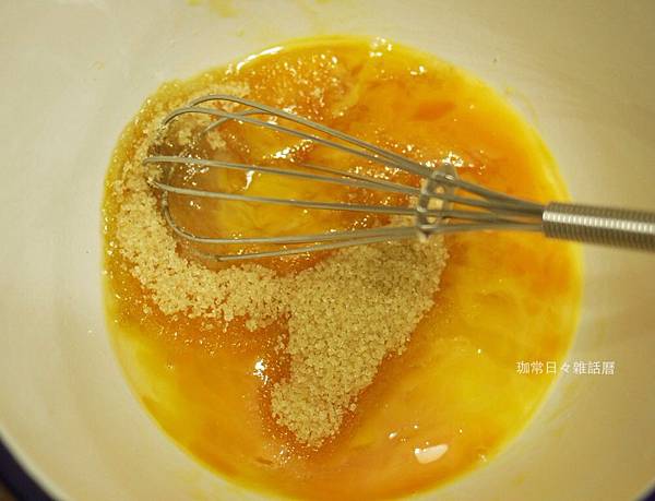 把糖放入蛋液用打蛋器攪拌打散至糖融化