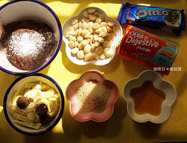 底層鋪了層消化餅,內餡夾了OREO餅乾和夏威夷果碎片