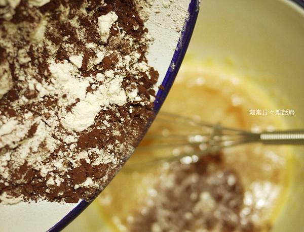 加入已過篩的麵粉及可可粉和泡打粉,慢慢攪拌均勻