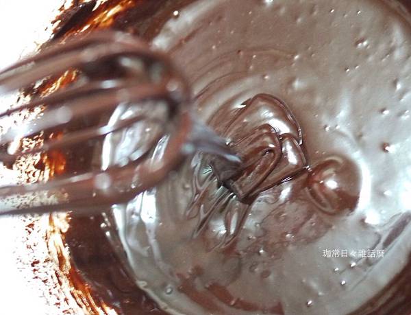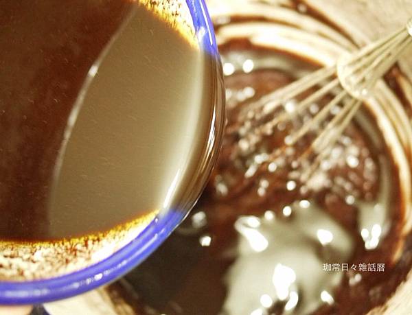 倒入先前已融化的巧克力奶油,一起拌合均勻成麵糊狀