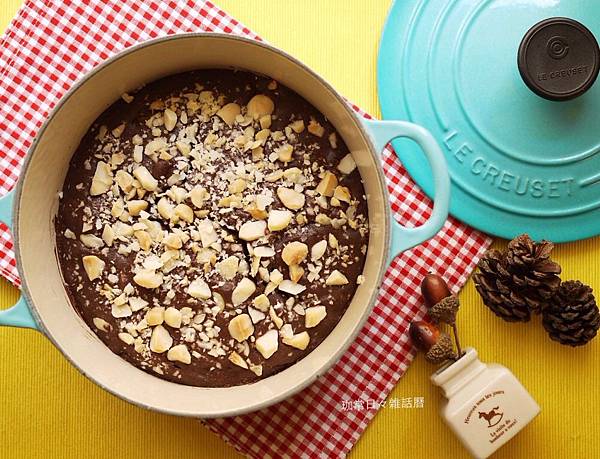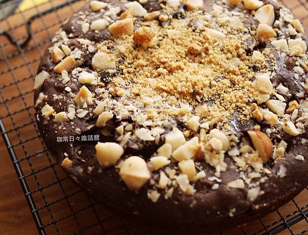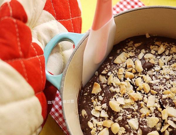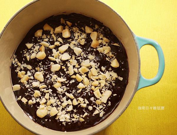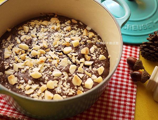 接著倒完剩下的麵糊,再撒上一層的夏威夷果碎片