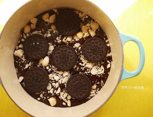 在麵糊表面撒上切碎的夏威夷果,再鋪上OREO餅乾