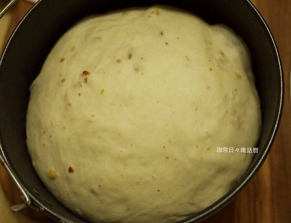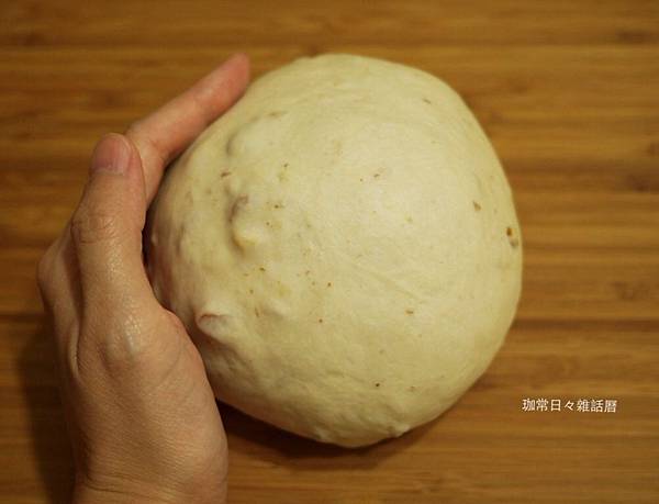 將麵糰材料除了堅果之外都先用機器攪打或手揉成無粉狀並不黏手之麵糰後