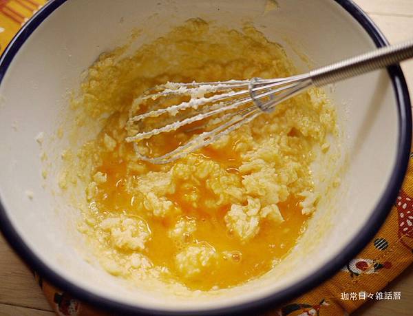 將蛋液打散後分次倒入奶油泥中攪拌均勻