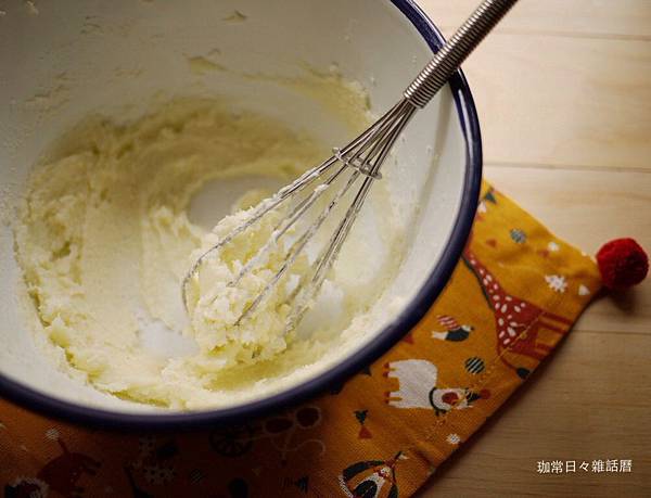 奶油於室溫下軟化後,用打蛋器攪拌成泥狀再加入細砂糖攪打均勻成微白狀
